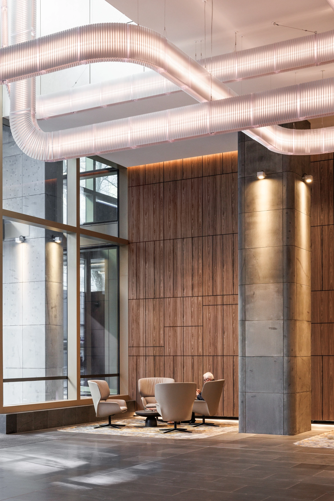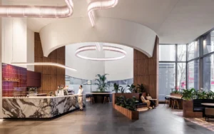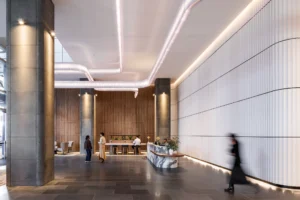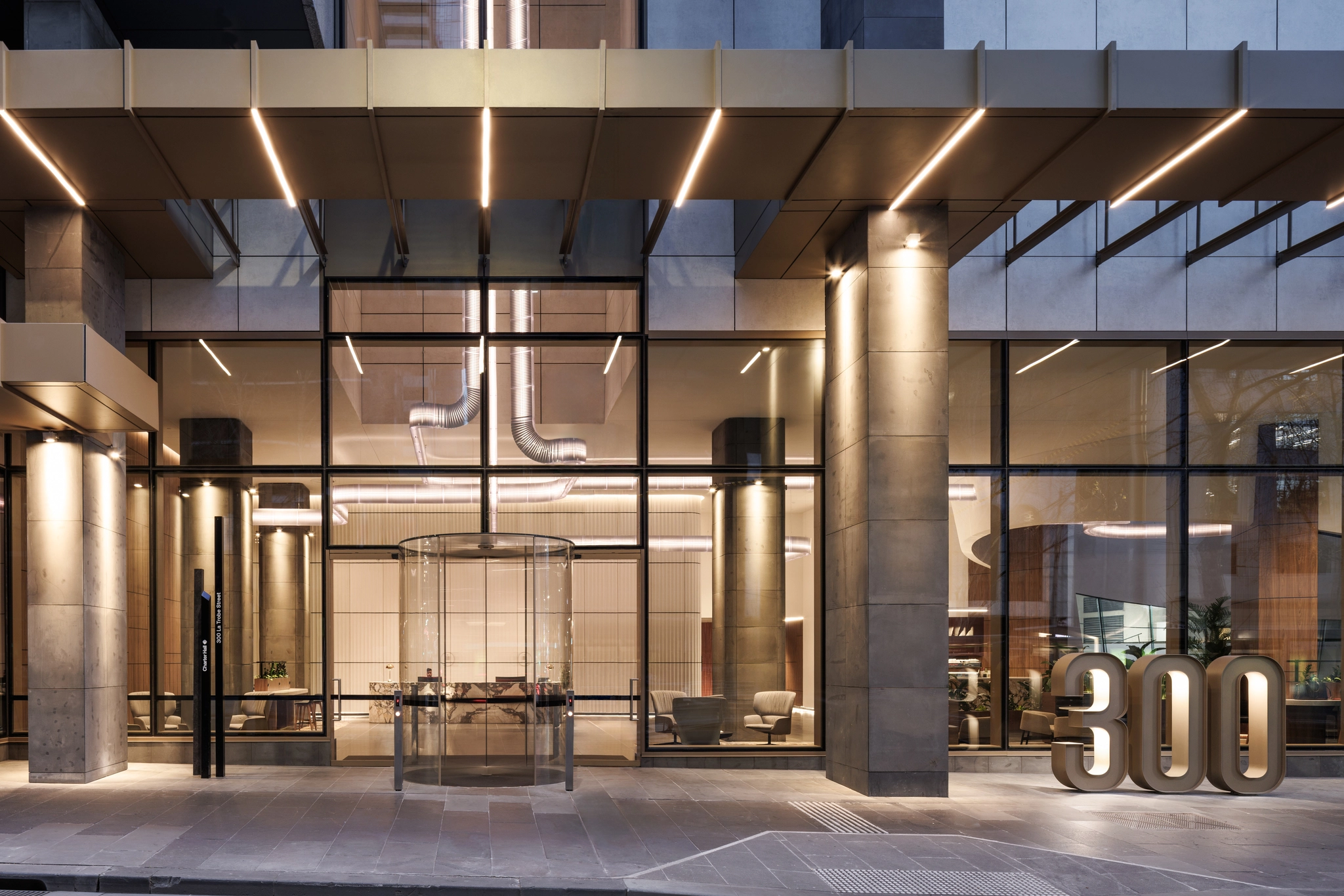 „300 La Trobe“ projekte Gray’us Puksand’as kuria įėjimą, kuris natūraliai nukreipia perėjimą iš gatvės į vestibiulį. Kruopščiai derinant šviesą, erdvę ir medžiagas, įėjimas iš karto perteikia ramybės ir kokybės pojūtį. Didelės erdvės ir švelni natūrali šviesa sustiprina erdvinę patirtį, suteikdamos atvykimui atvirumo jausmą.